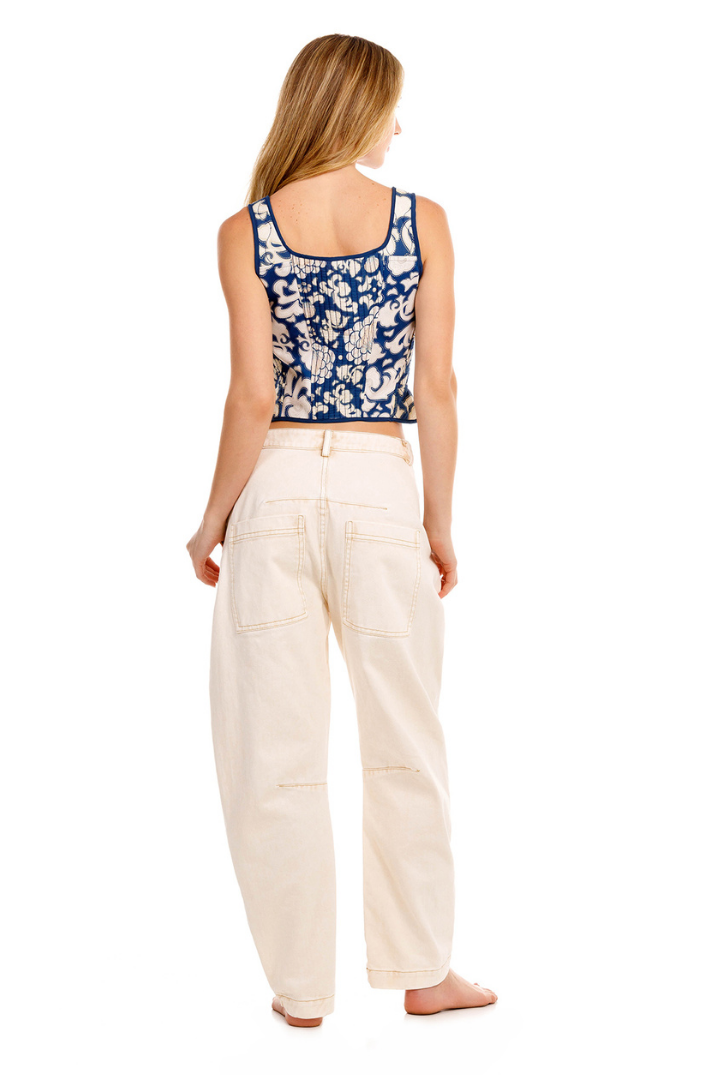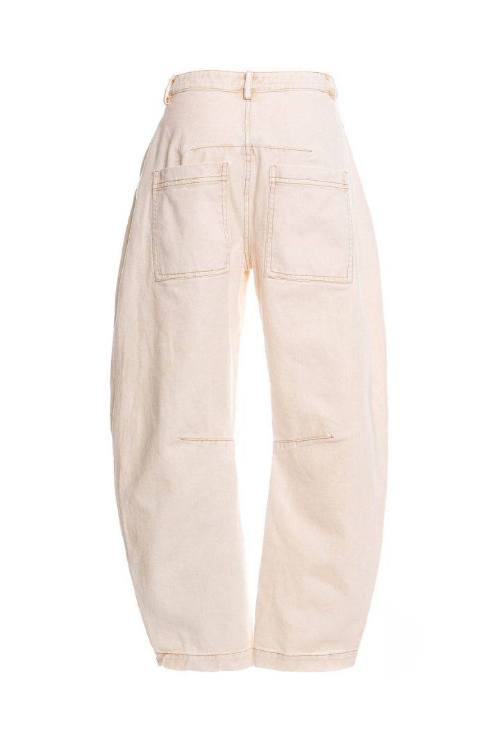 The Fallon Pants feature a modern barrel-leg silhouette with zip fly and button closure.
