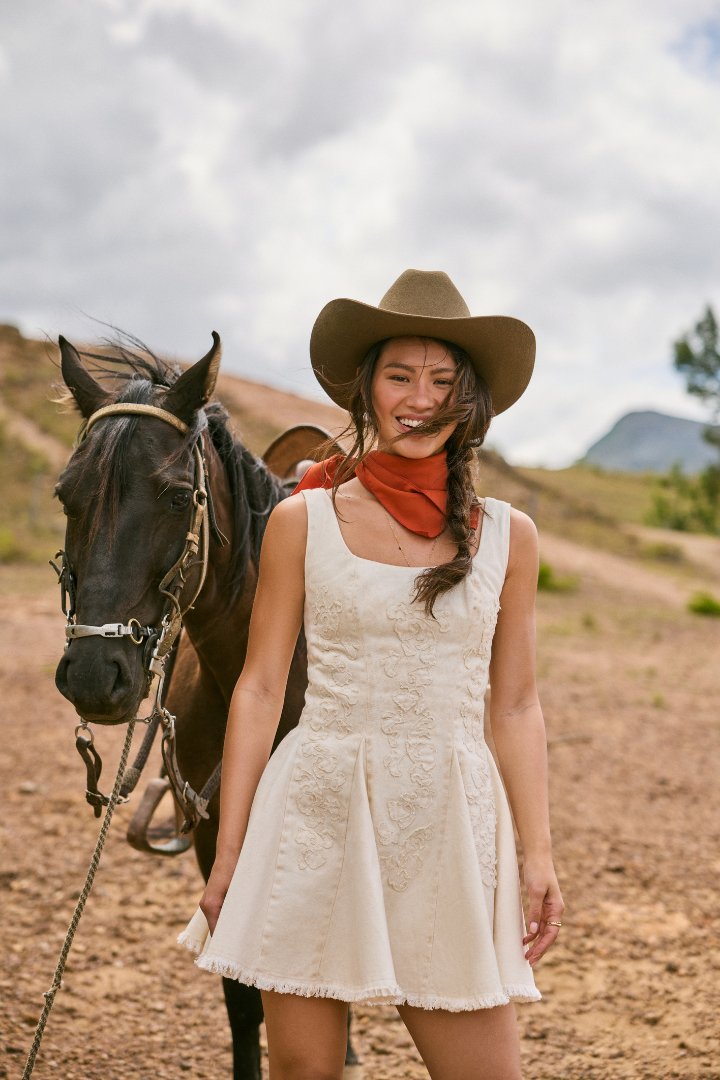 The Kristen Dress blends structure and charm in a fresh, cotton silhouette. Its fitted bodice shapes the figure, while the pleated skirt adds volume and movement. The smocked back ensures a comfortable fit, and distressed floral details bring a touch of texture. Finished with a subtle frayed hem for a lived-in yet elevated look.