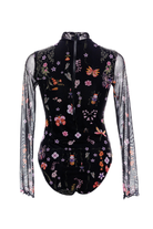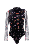 The Mei One Piece is a long-sleeve swimsuit with sheer mesh sleeves, a high neckline, and a placement print filled with small surreal-inspired motifs.