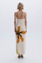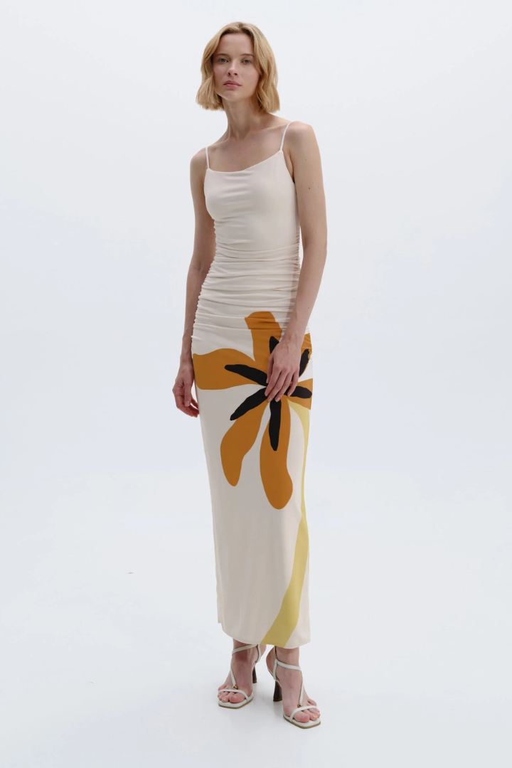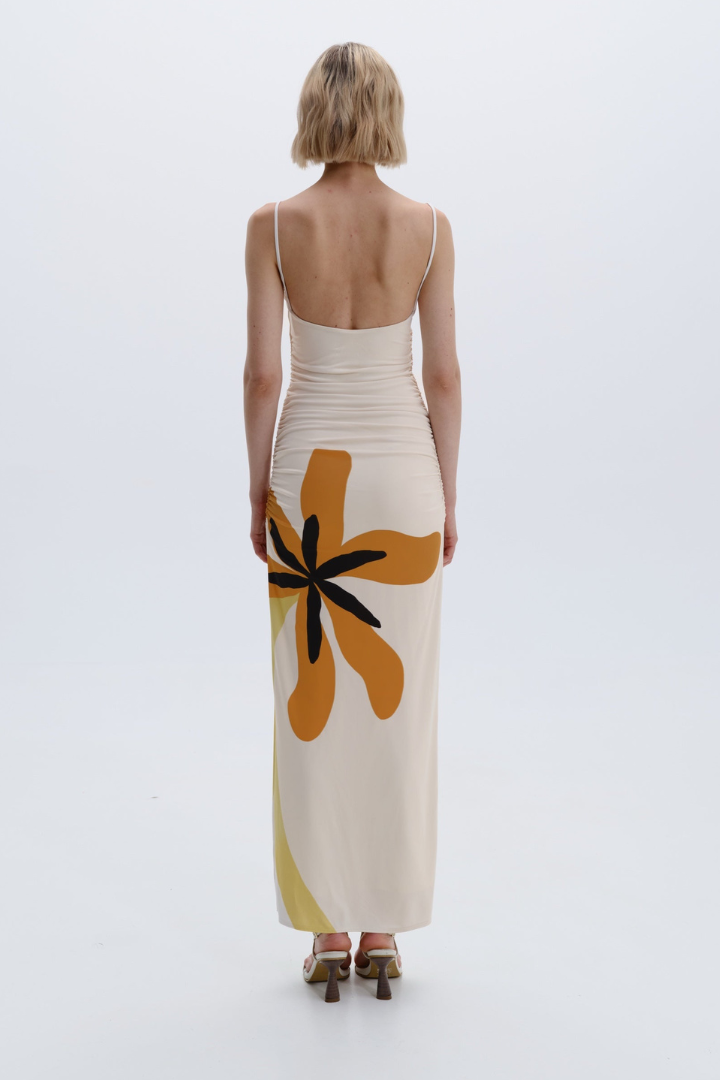 Long dress with a straight neckline, spaghetti straps, an open back, and gathered detailing on both sides of the waist.