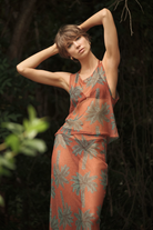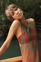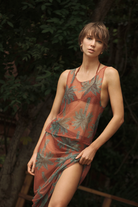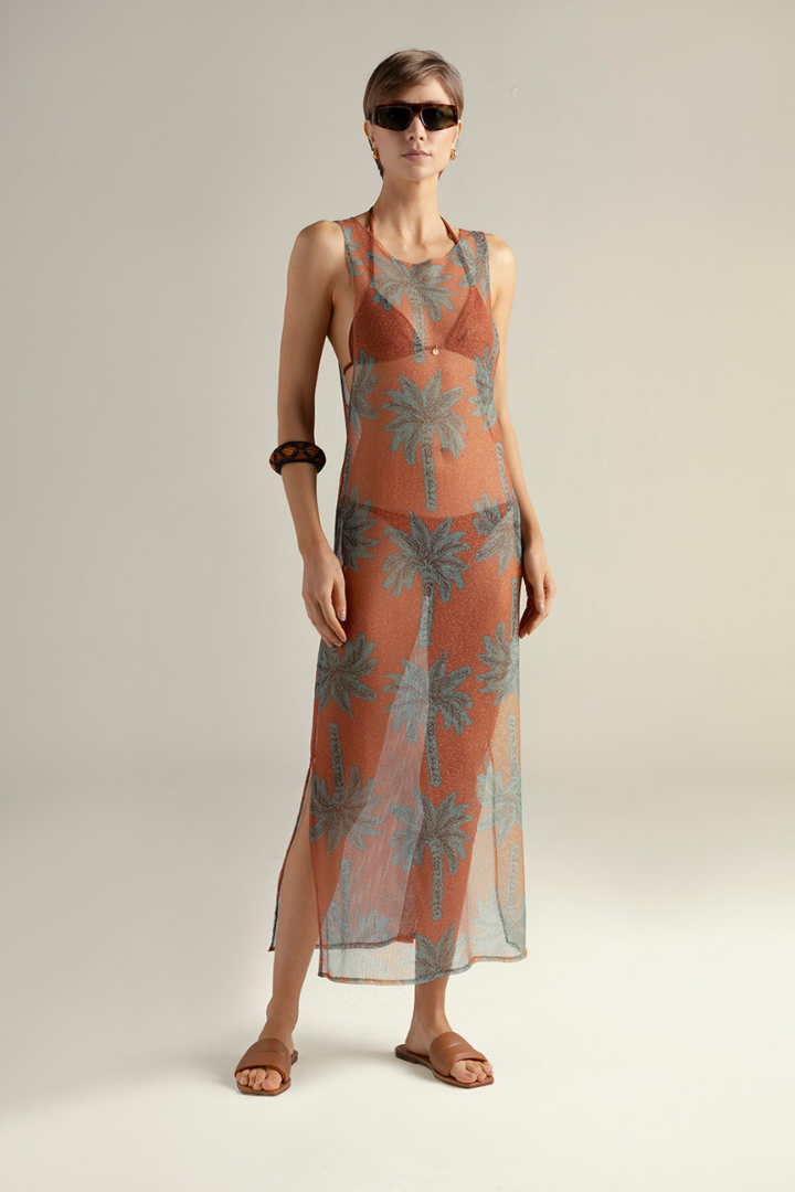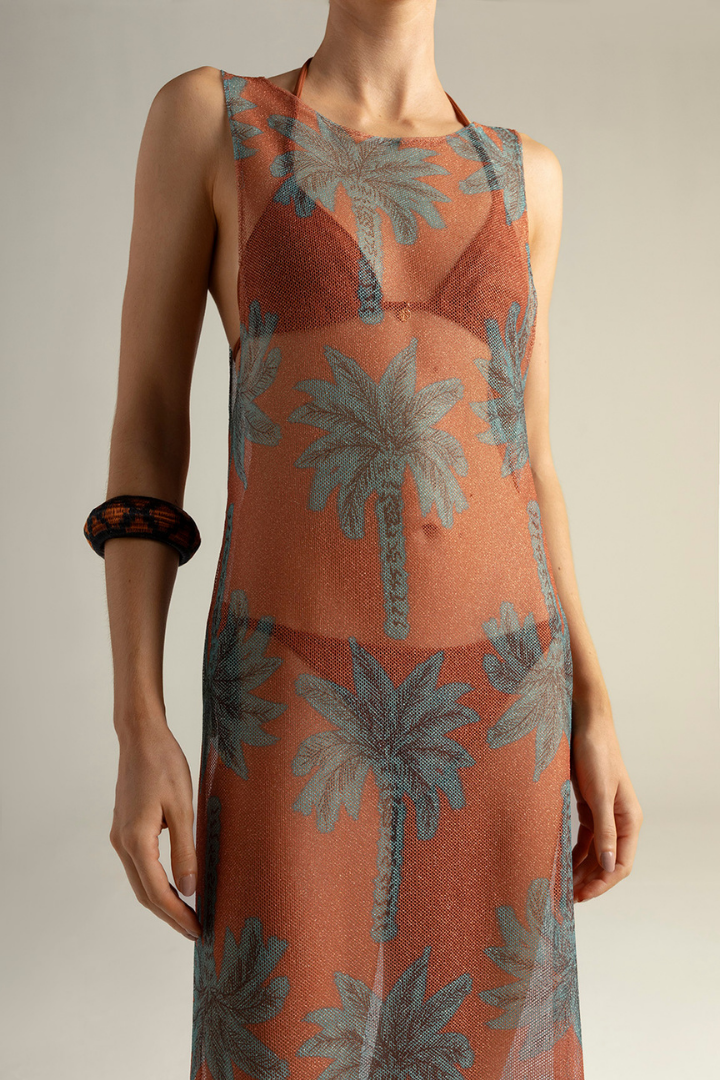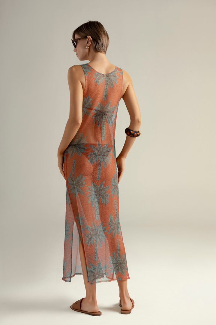 Long cover up in mesh fabric with plateden lurex in terracotta and blue palm trees print , Sleeveless, coin detail characteristic of our brand with "t" engraved in plated - plated to avoid oxidation.. Color print terracotta/blue/ plateden lurex, Ref. 0A75061