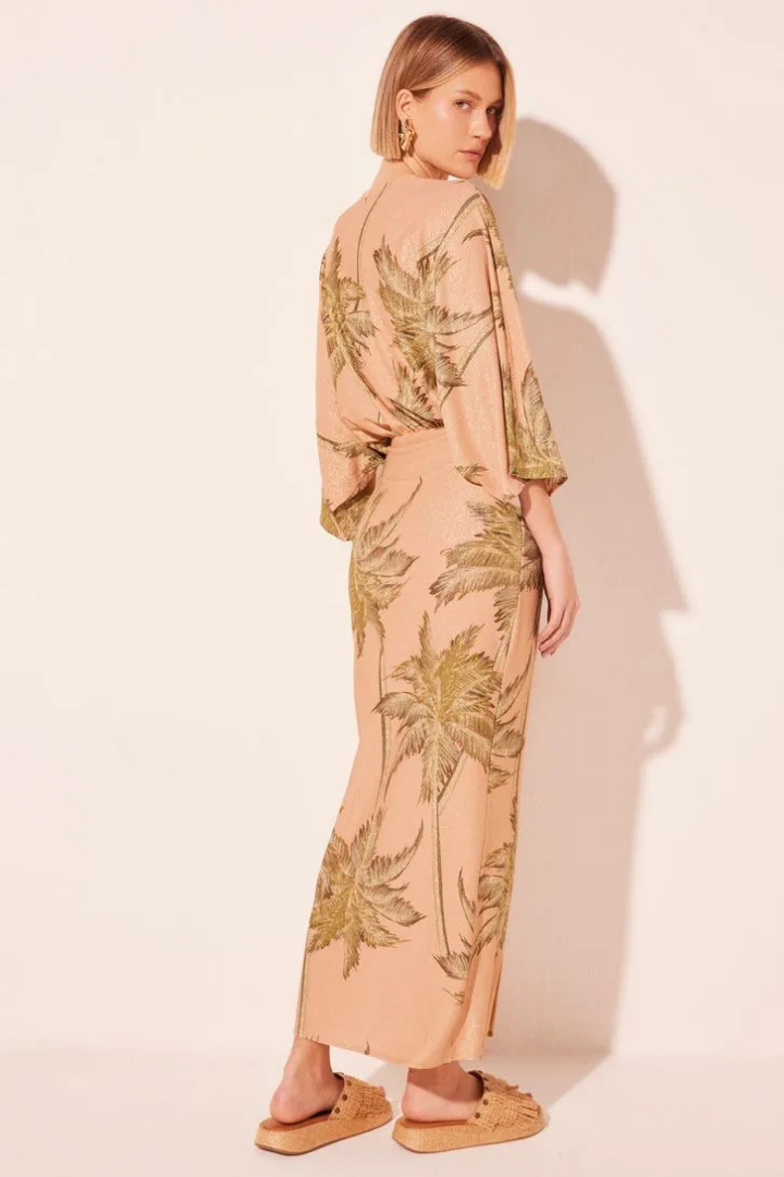 The Palmeiras Rosé Short Dress, made of viscose georgette, is short in length and lightly tailored with asymmetrical ruffles on the skirt, which give it movement and fluidity. The long sleeves with elasticated cuffs and the tie at the neckline balance charm and comfort, while the tie at the waist highlights the femininity of the piece. The dark green palm tree print on a rosé background completes the look with softness and natural shine.