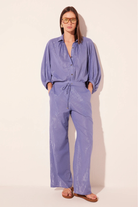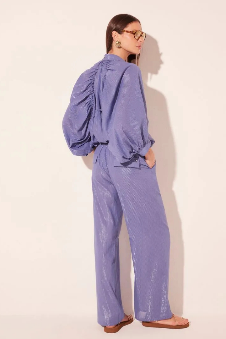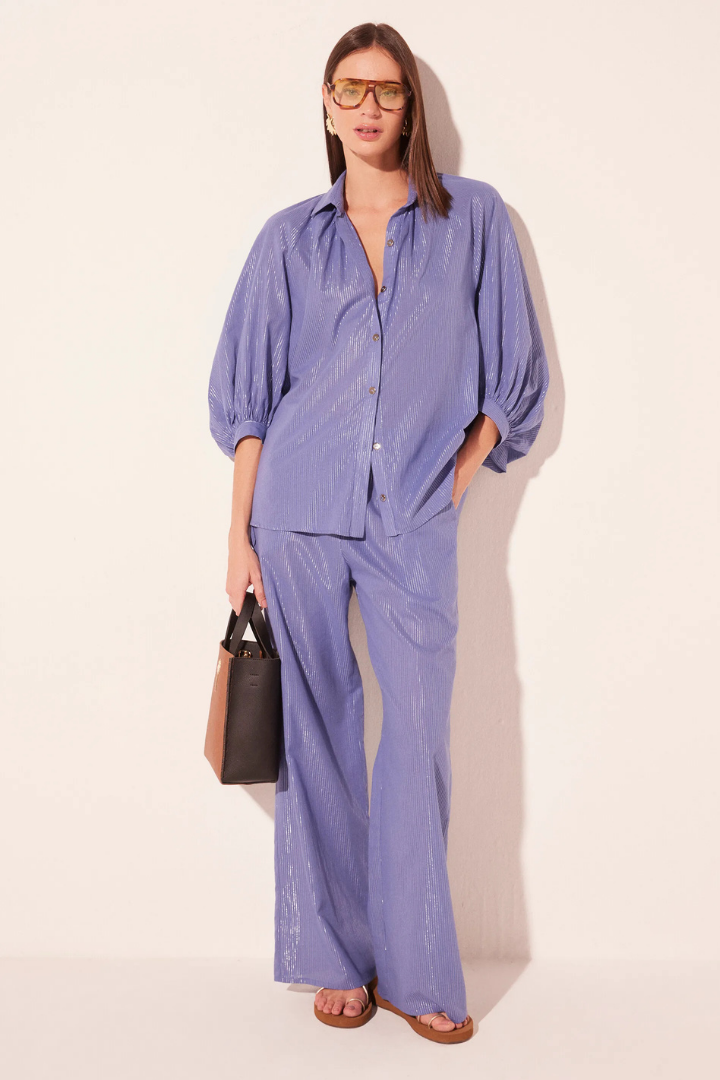 The Nectar Marine Long Sleeve Shirt, made from shiny striped cotton, features a traditional collar and front button placket, balancing classicism and lightness. The 7/8 puff sleeves with offset armholes add volume and femininity, while the thread ruffle detail on the back adds movement and artisanal charm. The mullet style, with side slits and a loose shape, provides fluidity and comfort, highlighting the subtle shine of the stripes and natural sophistication.