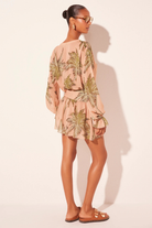 The dark green palm tree print on a rosé background completes the look with softness and natural shine.