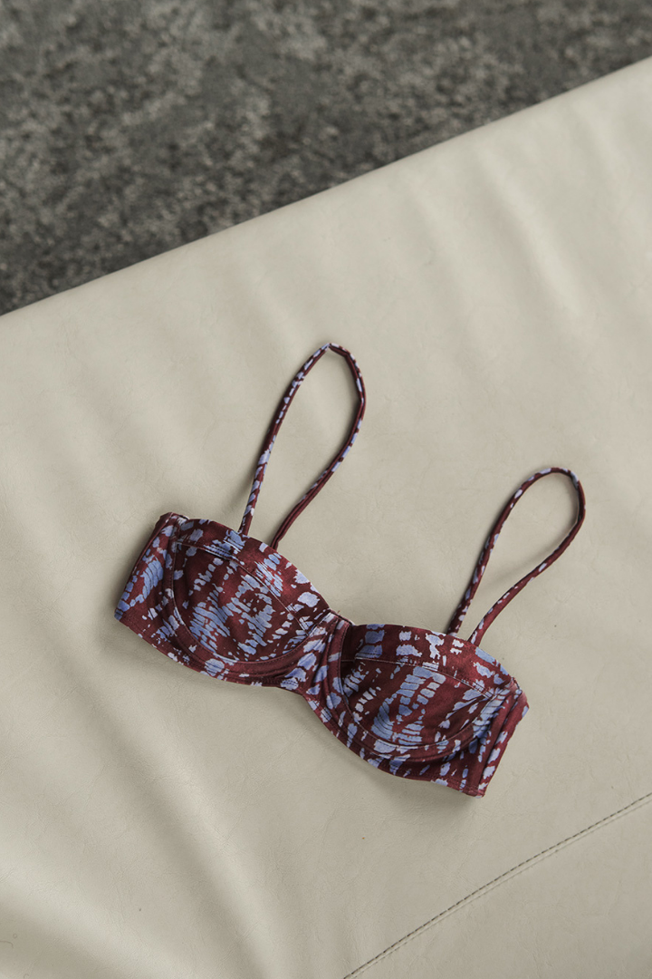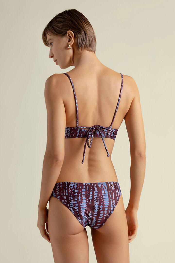 Retro bikini top in burgundy and blue animal print, with adjustable tie straps for a customizable fit and z closure with two adjustable positions, gold-plated details, removable padding, uv protection fabric. Color burgundy/blue animal print