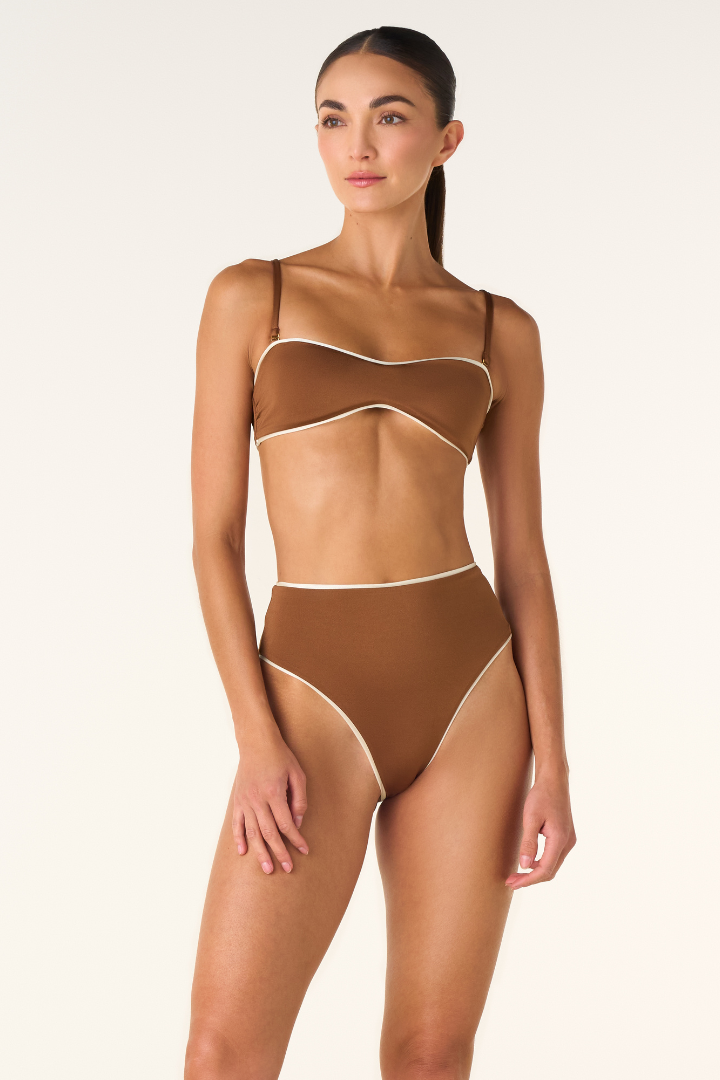 The Banu Espresso Bikini Top stands out with its structured silhouette and warm tone.