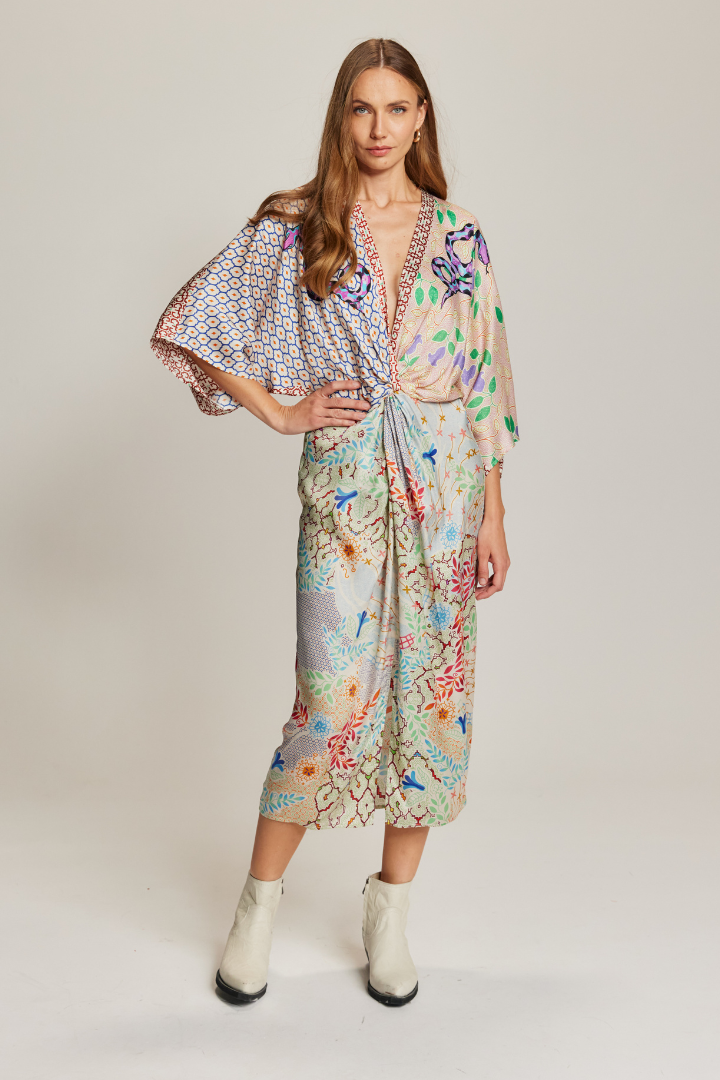 Top of dress is blousy and twisted at the waist, skirt of dress is narrow with a front slit.
