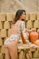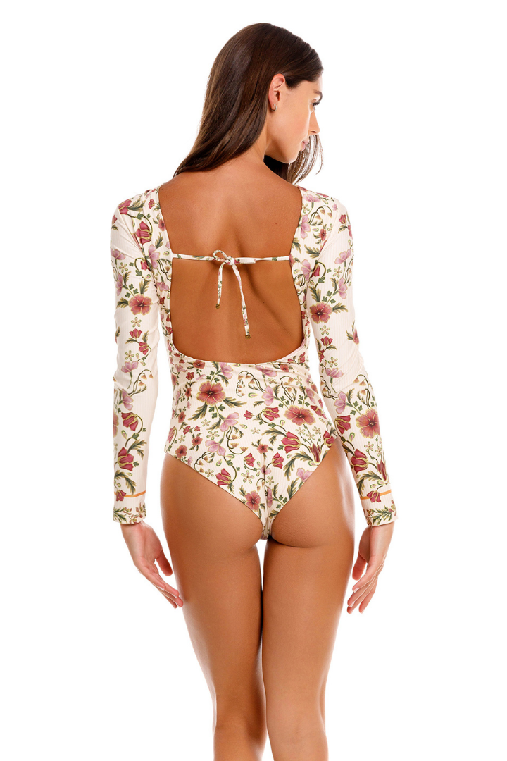 Designed with long sleeves and an open back, this suit is elevated by subtle strap details and a placement print inspired by Aura’s vintage-illustration aesthetic.