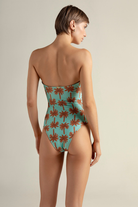 Bandeau one piece in blue and terracotta palm trees print, textured fabric with lurex, plateden accessory, removable and adjustable tie straps for a customizable fit, silicon elastic for better adherence to the skin, gold-plated details, removable padding, uv protection fabric. Color print blue/terracotta , Ref. 0E44061