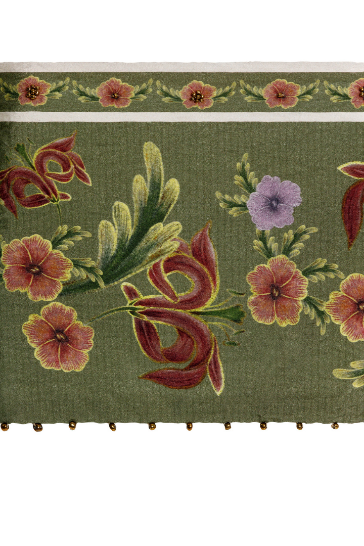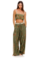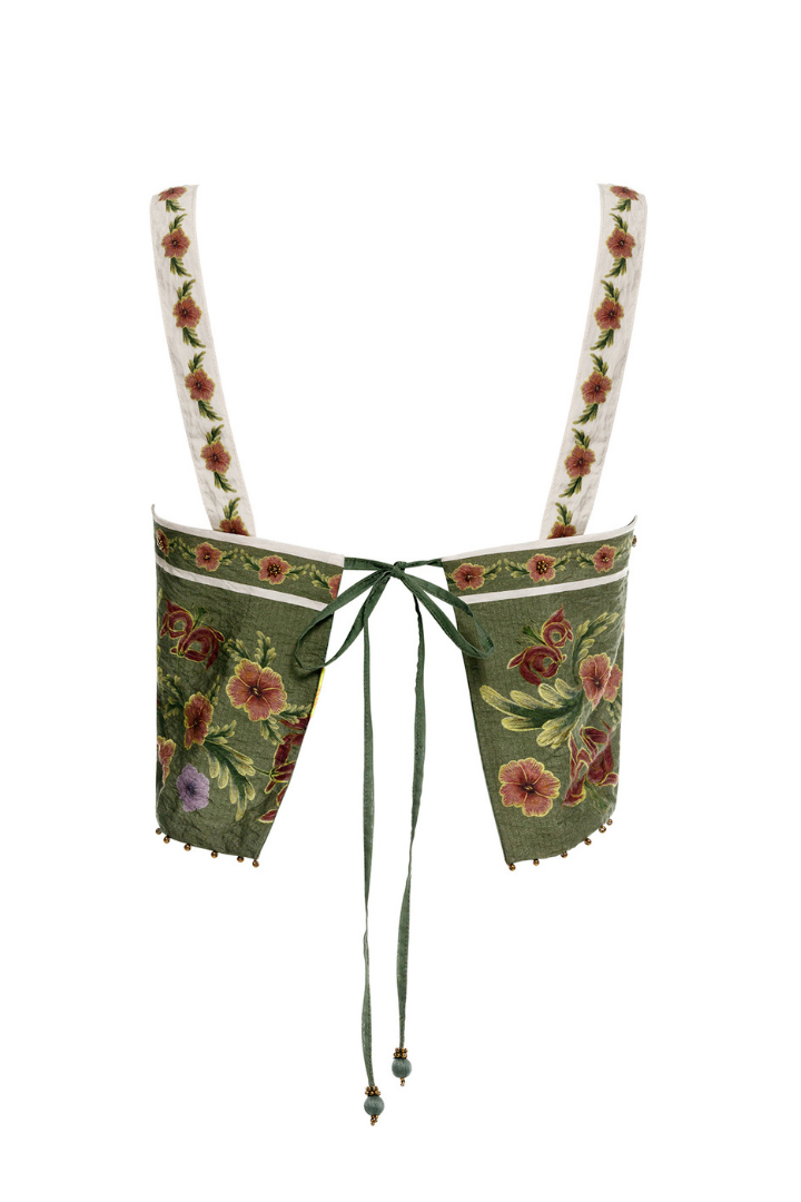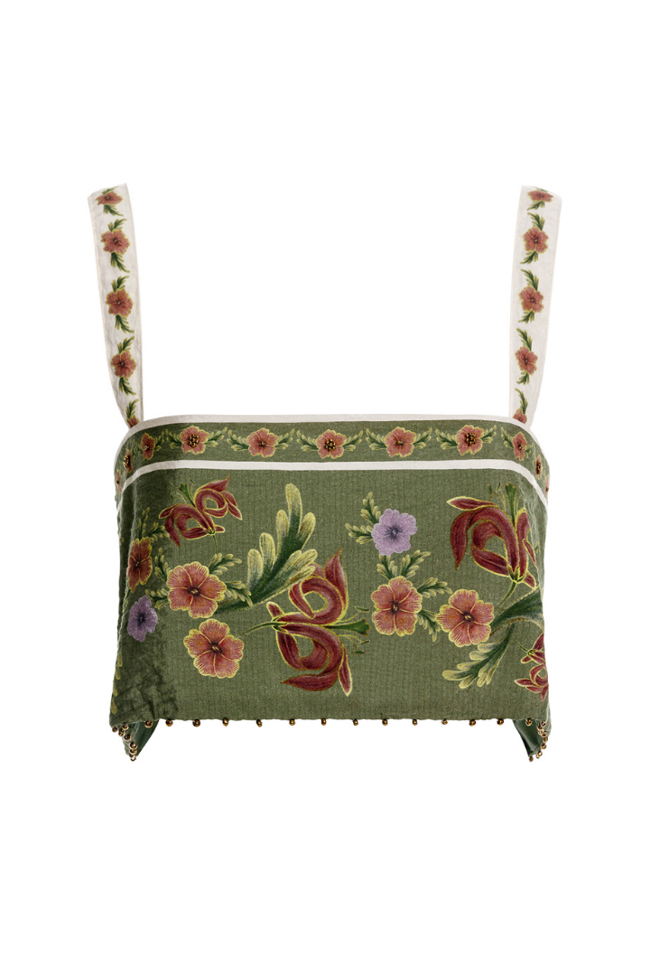 The Senja Crop Top blends comfort with artisanal charm, featuring a delicate floral placement print and handcrafted trim details.
