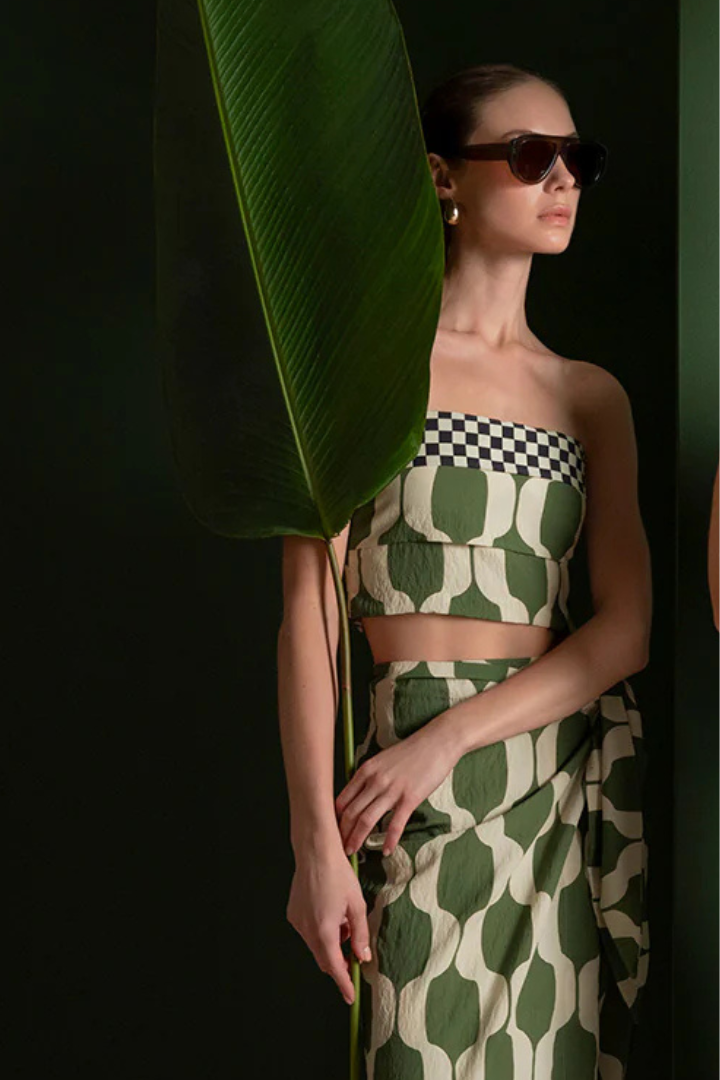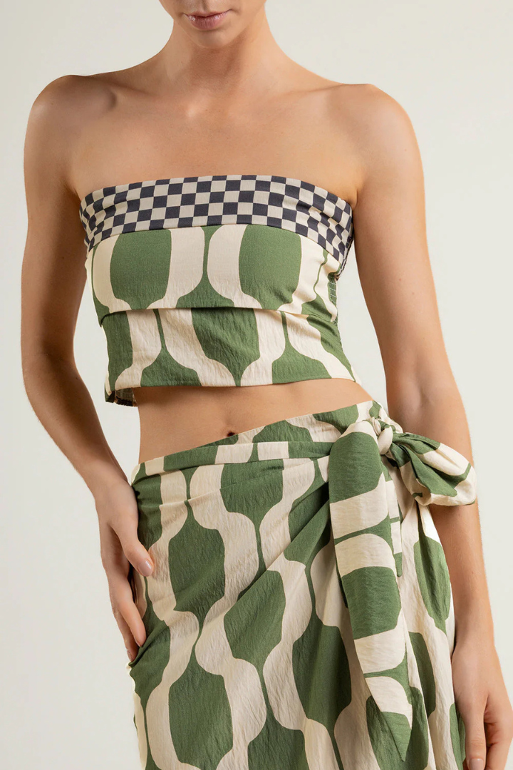 Bandeau top in off-white, green and dark blue print fabrick with smocked detail