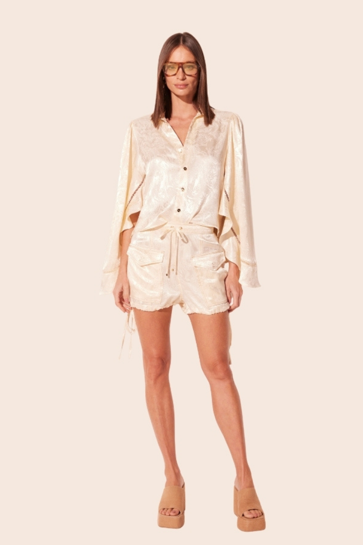 The Prisma Off White Short Shorts, in rayon jacquard, feature an elastic waistband and drawstring with tips, ensuring comfort and a perfect fit.