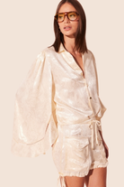 The tie at the hem adds movement, while the jacquard provides texture, sophistication, and charm to the piece.