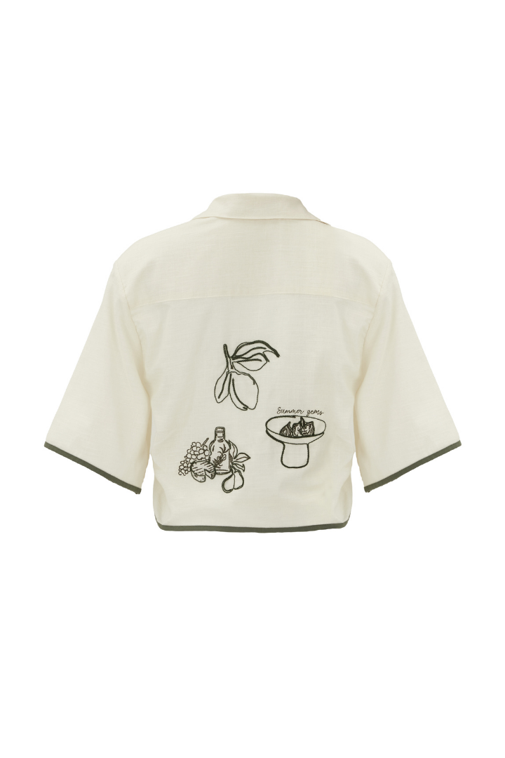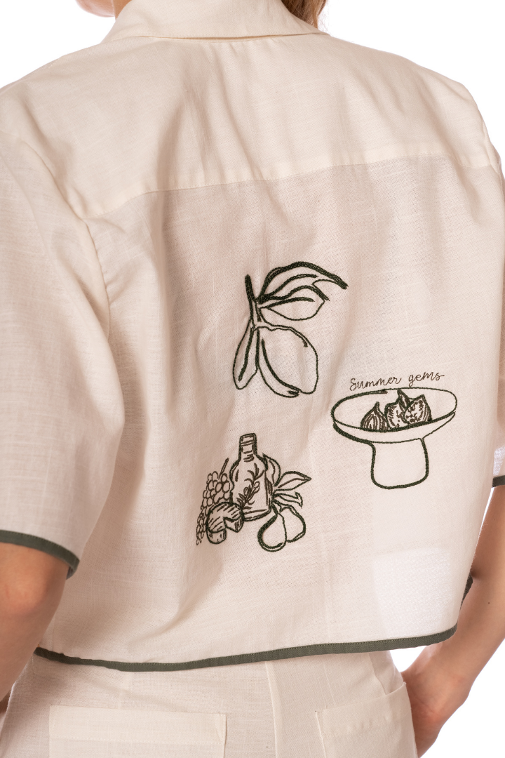Cut from lightweight linen in a warm ivory tone, it features contrast piping in sage green and delicate embroidery that evokes the slow pleasures of the Mediterranean coast — fruits, olive oil, and the sun-drenched beauty of life.