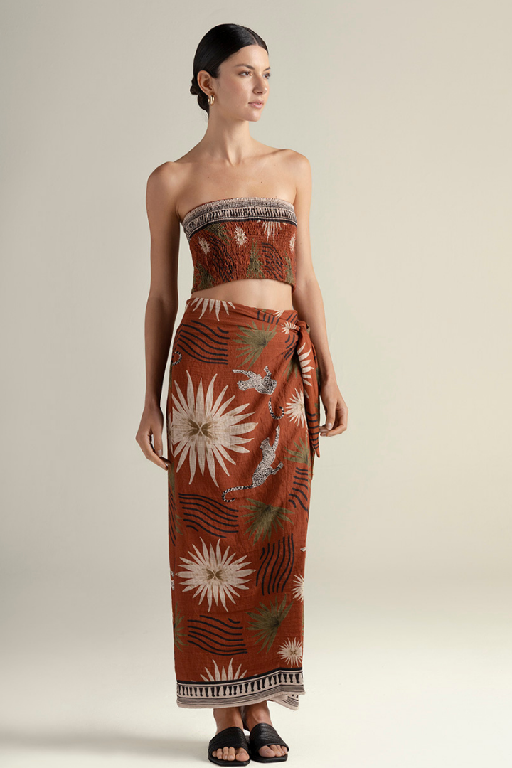 Pareo skirt in terracotta print, crossed in front with inner button, adjustable tie straps for a customizable fit, gold-plated coin detail characteristic of our brand with "t" engraved