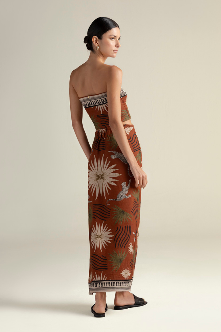 Bandeau top in terracotta print fabric with smocked detail, interior lining.