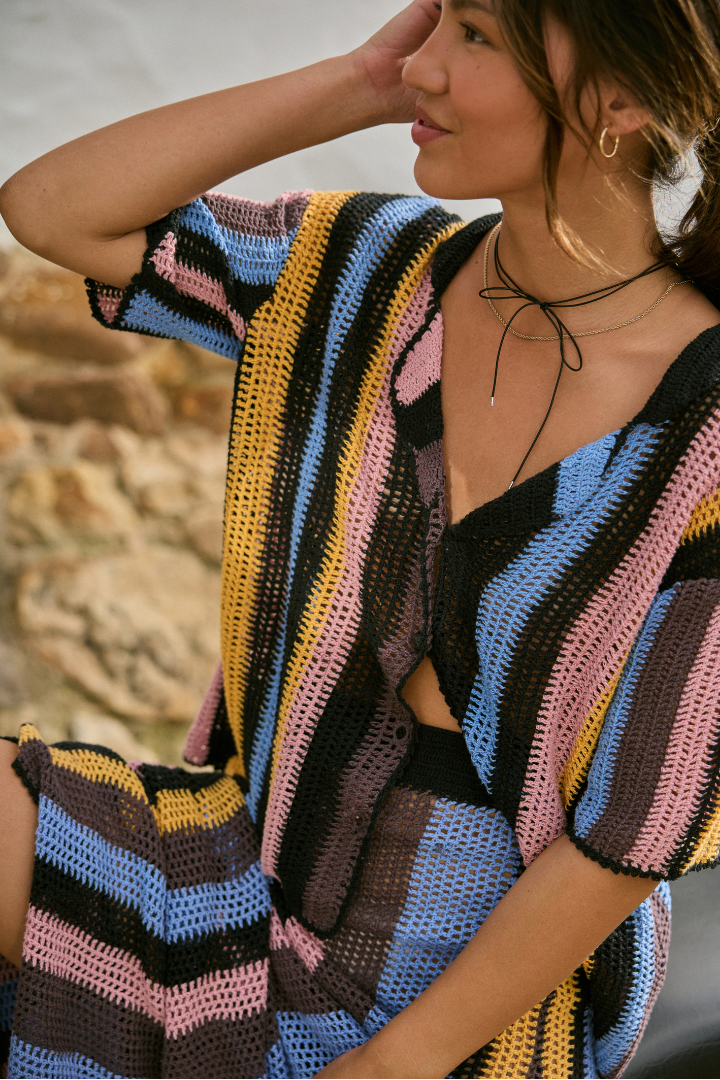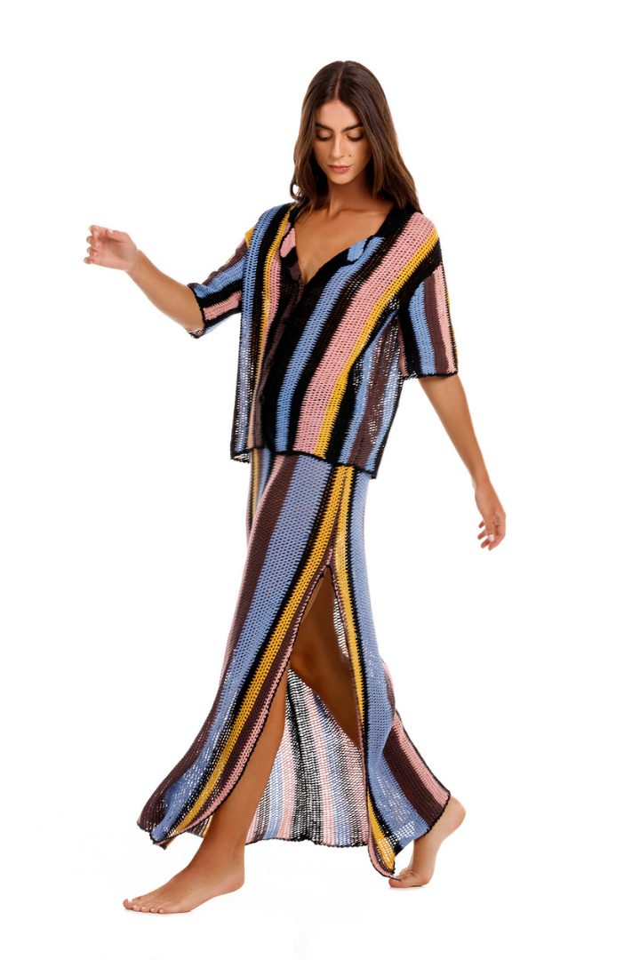 Made in colorful striped crochet, this maxi skirt features an elastic waistband for comfort and ease, and a playful leg slit that adds movement and edge.
