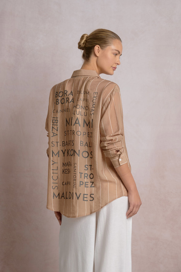 Bring vacation vibes to your wardrobe with the "Vista" Button-Down Top. This chic top showcases graphics on the back featuring everyone's favorite destinations. Elevate your casual style and let your imagination wander with Vista, making it the perfect choice for a laid-back and trendy look.