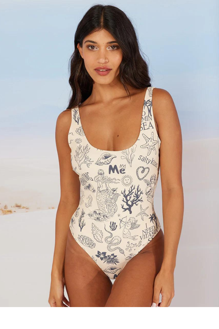 - Classic fit full swimsuit with playful stars and sea creatures print