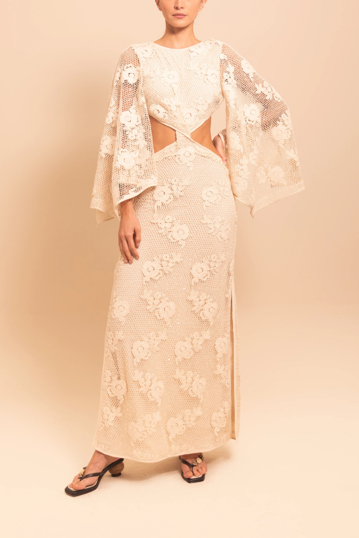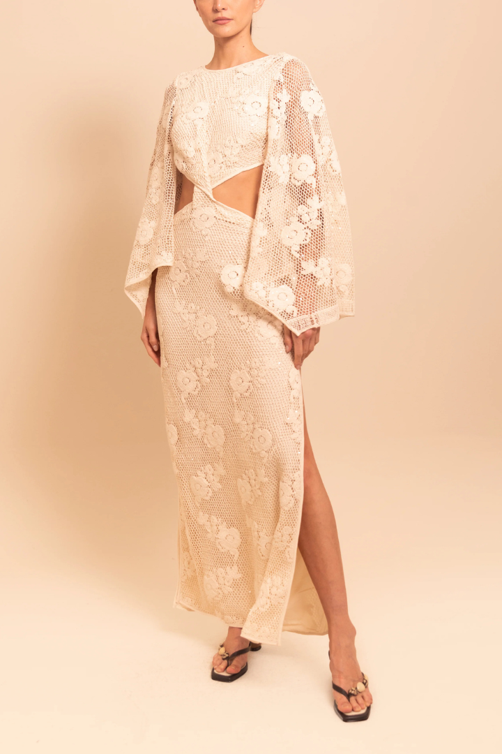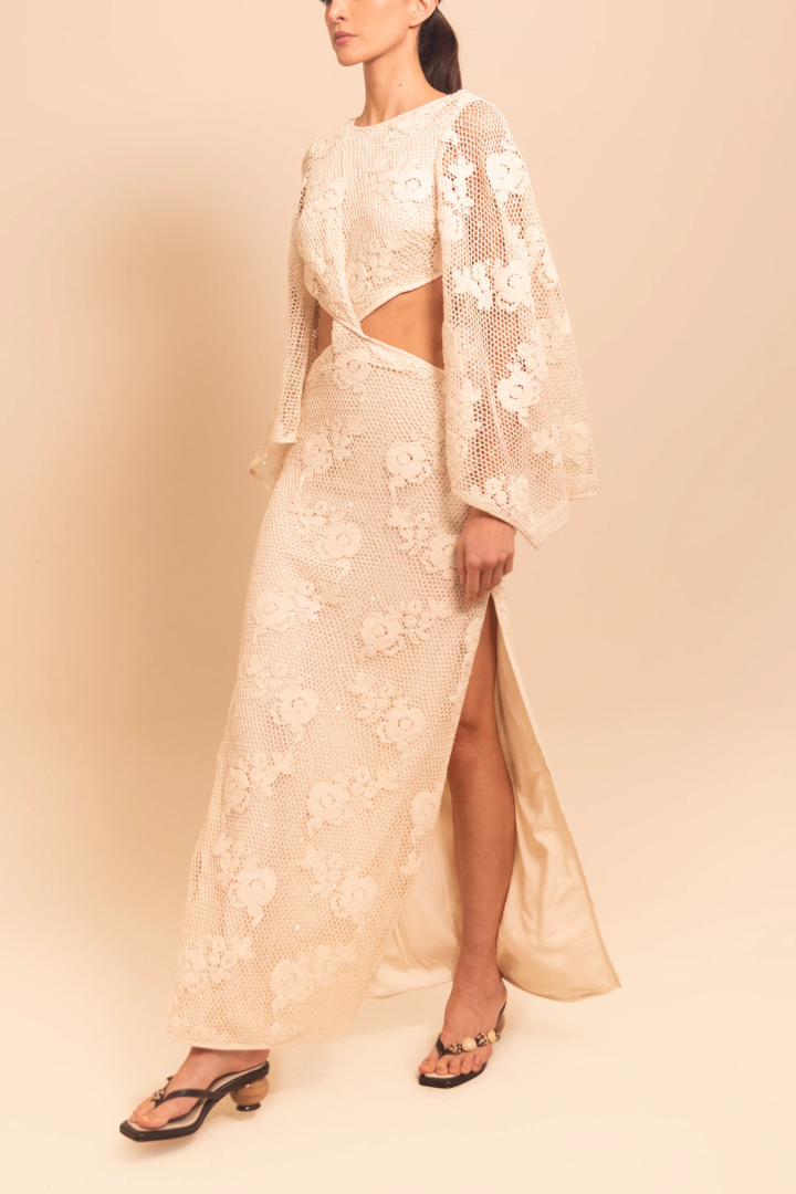 The Korzo Dress in ecru is a statement piece crafted in artisanal floral crochet with a soft inner lining.