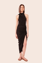 The gathering at the front and back sides gently shapes the body, and the skirt with a slit and inverted asymmetrical drape adds movement and fluidity.