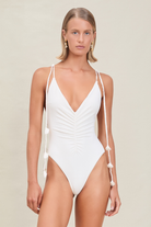 The Carmella is a V-cut full-piece with adjustable shoulder straps, rouching details in the center front, and petal detailing at the ends of the straps. Moderate back coverage.