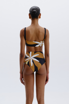 Straight neck bikini top and low open back.