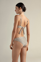 In beige and black print fabric, with lurex, matte black ring details, adjustable straps and tie-back closure for a custom fit, matte black accessories , removable padding, uv protection fabric. . Color print black/beige/ plateden lurex, Ref. 0B63061