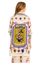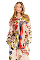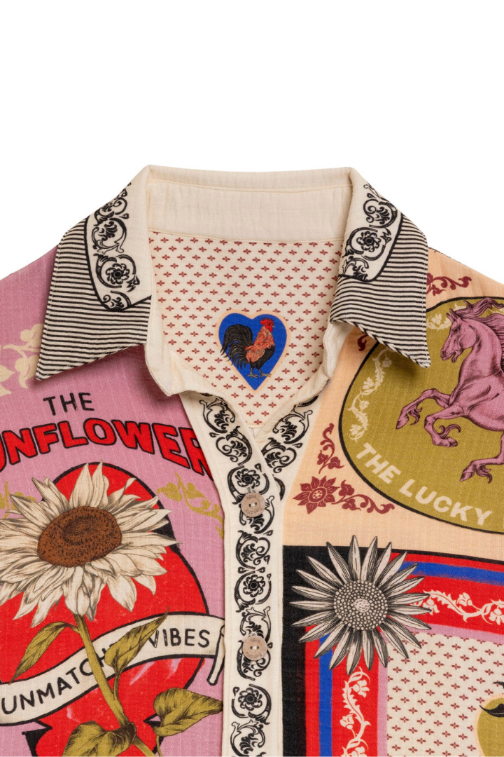 The Anastasia Shirt reimagines vintage matchbox art into a wearable canvas. Designed as a long shirt with front button closure, this piece carries a striking placement print filled with symbolic motifs and rich colors. Perfect to wear open over swimwear, or styled as a statement shirt for day-to-night transitions.