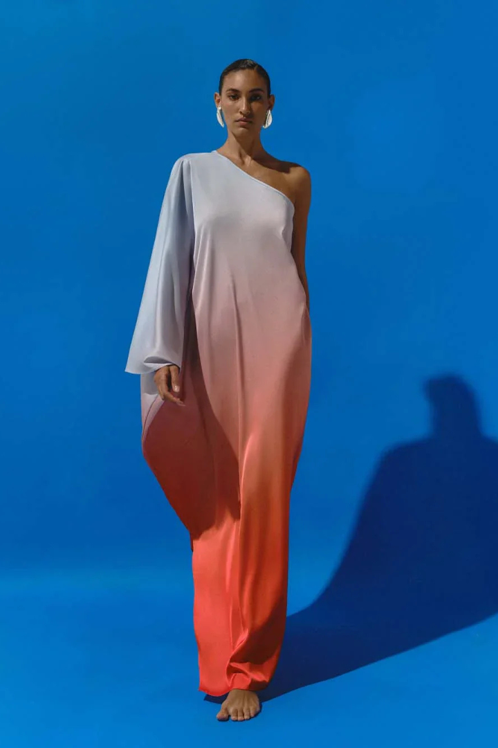 Introducing the "Riva Maxi Dress" in Flame – a one-shoulder maxi dress with a draped asymmetric sleeve and hemline.